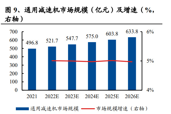 我国通用减速机市场规模近 500 亿,整体增速稳健。据前瞻产业研究院,2021 年 中国减速机市场整体规模达 1258 亿元,其中通用减速机约 496.8 亿元,占比达 39.5%。到 2026 年中国减速机行业整体规模将达 1605 亿元。按照 2021 年通用减 速机的市场规模占比进行估计,预计 2026 年通用减速机市场规模将达 633.8 亿元, 2021-2026 年间,每年同比增速维持在 5%左右。