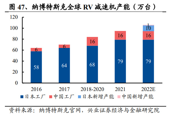 构建覆盖面广、管理水平高的全球化服务和生产网络是各大减速机厂商的常用发 展战略。哈默纳科在全球共有 11 家子公司,通过在当地建立分公司及办事处来保 证公司的服务质量。向客户提供全方位的售前、中、后服务,可以有效地提高客 户粘性。对经销商进行培训能改善经销商的服务质量,提高客户口碑和获客能力。 经销商的管理水平也会影响到公司的经营周期,继而影响收入质量。纳博特斯克 积极拓展产能,贴近下游需求,除日本本土外,纳博特斯克还在中国常州建有工 厂,有助于技术服务的本土化落地及增强客户粘性。据纳博特斯克披露,预计 2022 年全球总体产能增至 106 万台。