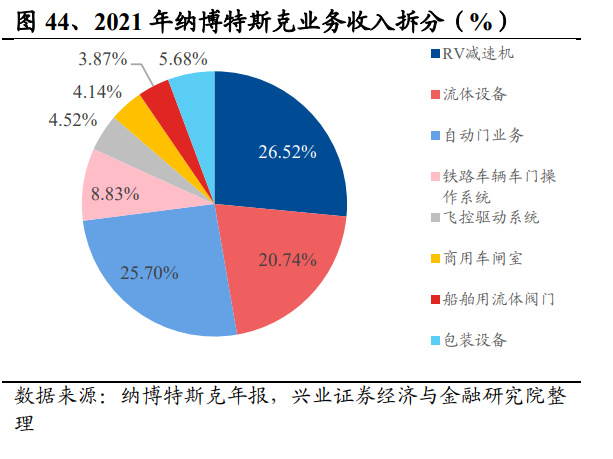 纳博特斯克是减速机行业中采用收购、并购战略的典型案例。纳博克公司成立于 1925 年,主要制售铁路车辆用空气制动装置和液压装置;帝人航空工业早在 1985 年就开始进行 RV 减速机技术的研究开发。日本帝人航空和纳博克于 2003 年合并 为纳博特斯克。合并之初,双方对之前掌握的液、气体控制技术及切削加工、装 配工艺技术进行了结合与升级迭代,帝人也凭借着纳博克在液压设备领域积累的 经验和技术对其 RV 减速机产品进行了升级和完善。在成立之后,纳博特斯克进 行了大规模的业务中止和重组,为其后产业发展和海外扩张奠定下基础。在一段 时间的磨合之后,纳博特斯克将利润水平高、发展前景广、技术壁垒高的 RV 减 速机、车辆设备及自动门业务定位为公司未来的核心发展方向,同时终止了 IT 和 摩托车配件等与核心技术竞争力关系较小,且盈利能力较差的诸多业务。2004 年 来,纳博特斯克更是先后对 9 家公司进行了收并购,通过收购成熟的业务线,公 司实现了在铁路车辆设备、商用车辆闸室、自动门及液压设备等行业的快速发展。