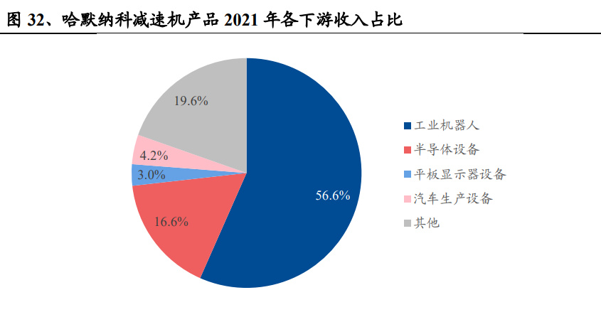 工业机器人是精密减速机下游最主要的应用场景。机器人每个关节运动均需靠伺 服电机驱动,而伺服电机输出转速大、输出扭矩小的特点与机器人关节结构实际 的输出转速小、转动扭矩大的需求正好相反,因此现有伺服电机的输出难以满足 终端机械本体的运动需求,所以就需要减速器这一传动零部件进行减速增距。除 了工业机器人,半导体设备、机床、汽车生产设备、显示平板生产设备均为精密 减速器主要的下游应用场景。以国际精密减速机巨头哈默纳科的下游收入占比情 况估计,约有 50%~60%左右的精密减速器被用在工业机器人领域中。