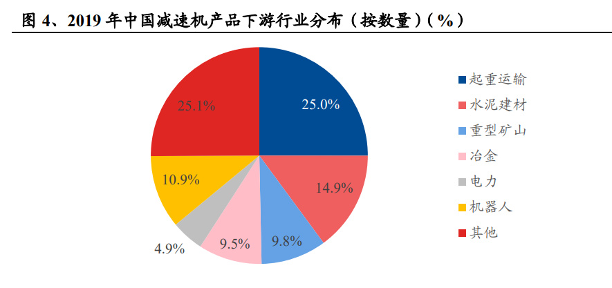 减速机下游应用广泛。减速机的下游应用行业主要包括起重运输、水泥建材、重 型矿山、冶金、电力、机器人等领域,此外还有化工、环保、能源、制药、粮油、 物流、纺织、航空航天、海洋装备国民经济及国防工业的各个领域。2019 年,起 重运输行业使用减速机产品的数量占比约为 25.0%,水泥建材行业使用减速机产 品的数量占比约为 14.9%,重型矿山行业占比约为 9.8%。