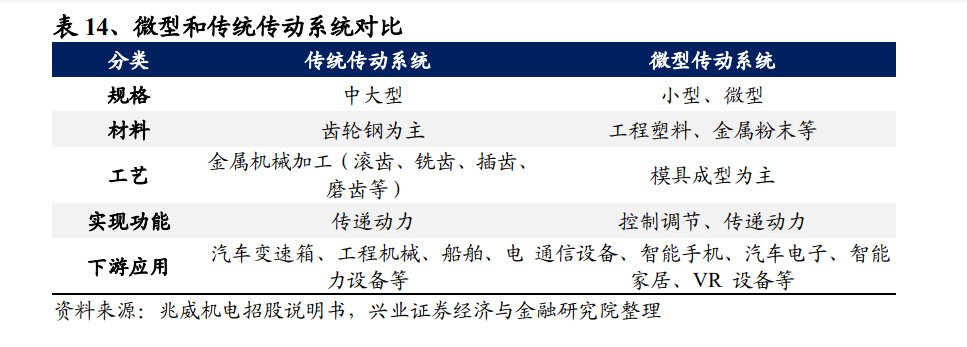 微型传动系统相较于传统传动系统具有“以塑代钢”特色。两者传动原理相同, 但传统传动系统主要起到传递动力作用,以合金钢为主要材料,齿轮生产工艺多 采用金属机加工的方式。而微型传动系统则主要起到控制调节、传递运动的作用, 主要使用工程塑料和金属粉末等材料,以模具成型工艺为主要生产方式。此外, 微型传动系统的设计开发、规模化生产装配与成本控制、微型齿轮模具设计与精 密加工、科学精密检测和试验等能力都是微型传动行业中的核心壁垒,与传统减 速机行业差别较大。