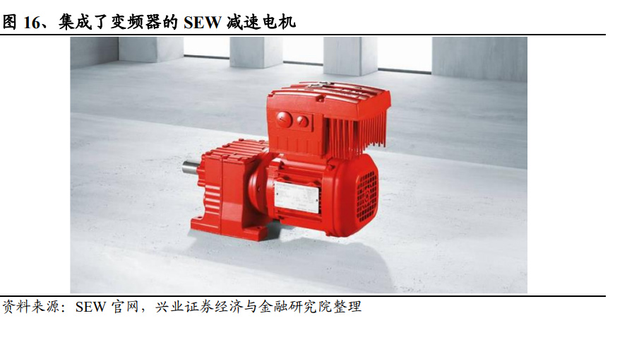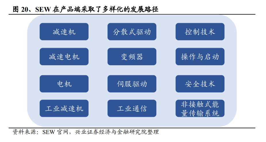 SEW 的产品线采用了多样化的发展策略。SEW 的通用减速机产品覆盖了斜齿轮、 平行轴斜齿轮、锥齿轮、蜗轮蜗杆、直角等不同形制的减速机,此外,SEW 也拥 有电机、变频器、伺服驱动、控制系统等一系列产品及技术,可与其减速机产品相互组合。产品的多样化使得 SEW 具备销售和服务层面的优势,能够更好地满 足客户对不同形制减速机的需求,以及对定制自动化整体解决方案的需求,在扩 大收入基本盘的同时,也使得 SEW 具备了向产业链下游拓展的能力。