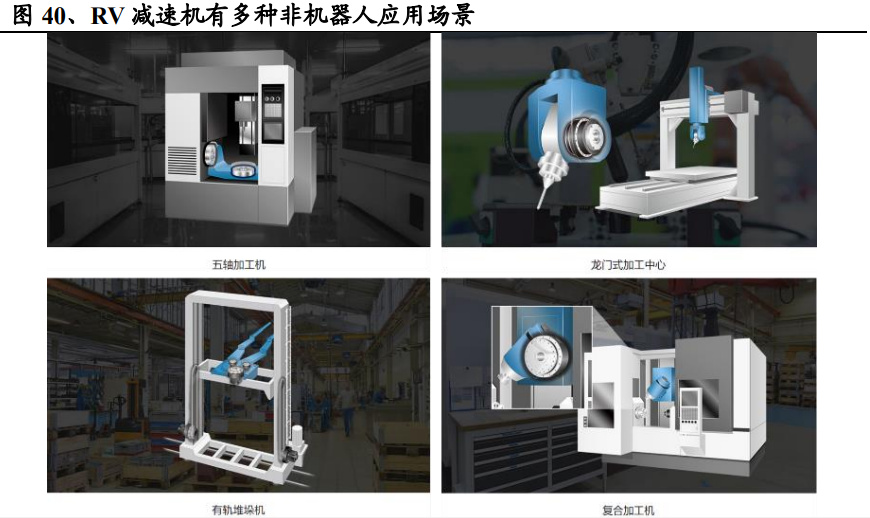 非机器人应用场景打开精密减速机市场空间。根据纳博特斯克官网,RV 减速器 也可应用于机床的刀具和工件的旋转定位,最常见的应用包括磨头、切割头、转 台等。谐波减速器在机床转台也同样存在使用场景。在以加工中心、铣床等为代 表的小型数控机床领域,谐波减速器可部分取代蜗轮蜗杆和直驱电机,用于机床 转台,每台机床配备 3-4 个谐波减速器。