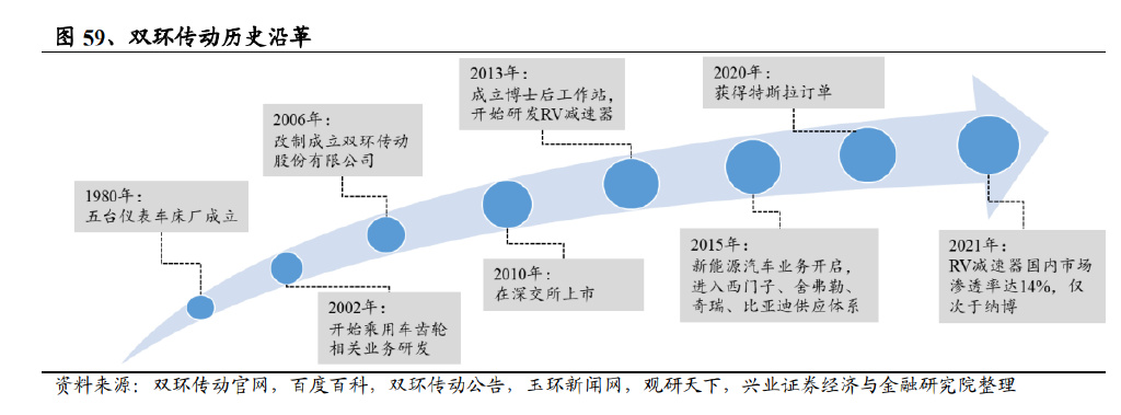双环传动在机加工齿轮行业深耕 30 余年,迄今已形成涵盖传统汽车、电动汽车、 高铁轨道交通、及工业机器人等多个领域门类齐全的产品结构,技术储备深厚, 是国内机加工齿轮领域的领军企业。双环传动通过 AT 自动变速箱配套齿轮业务 积累了稳定的行星齿轮加工、供应能力,辅以其在高精度齿轮领域的丰富研发生 产经验和核心工艺技术,双环传动自主研制开发出了工业机器人精密 RV 减速器 产品,并在国内率先实现量产。目前,双环的 RV 减速机产品在运行精度、噪音、 寿命等性能方面与国际龙头纳博相比已基本没有差异,具备国产化替代的能力。 双环传动的 RV 减速机产品在客户处反馈较好,市场粘性较强,目前 RV 减速器 业务已成为依托齿轮主线,驱动企业未来持续成长的“第二极”。