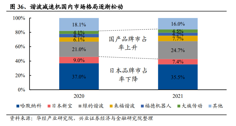 价格及本土优势推动中国精密减速器市场格局松动。近年来,随着以绿的谐波为 代表的国产谐波减速器企业的发展壮大和国内机器人行业的迅速崛起,日系龙头 企业在中国的市场份额呈降低趋势。这是因为日系机器人本体厂商与哈默纳科等 日企有长期协议,采购价格更低,国产自主品牌机器人厂商采购价则是日系机器 人厂商的 2-3 倍。自主品牌机器人主打性价比,采用日产谐波减速器成本过高,利润空间压缩严重。而国产谐波减速器目前已基本达到与哈默纳科相近的技术水 准,价格则比进口产品更低。此外,国产谐波减速器厂商还具有快速响应及服务 优势,交货期短,可实现场指导装配并及时维修,减少停工时间。