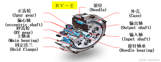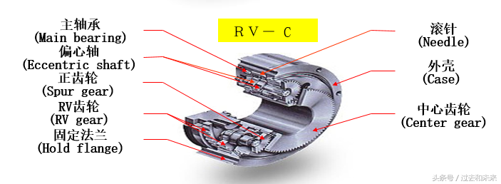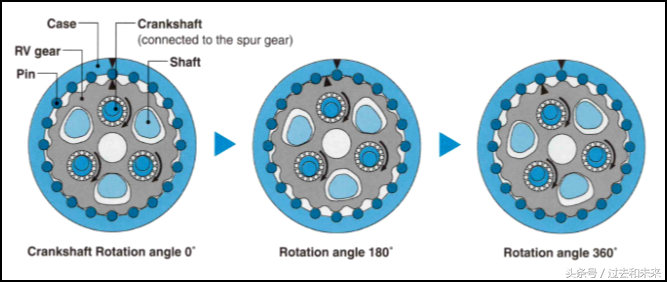 在外壳的内环圈内装有圆柱形的滚针,RV齿轮的偏心运动引起滚针与摆线形RV轮齿的啮合和脱离,产生多组RV轮齿与滚针同时啮合,提高负载能力。由于RV齿数比滚针少1个数目,因此当偏心轴旋转一周时,如果固定外壳(case),则RV齿轮与输入轴同向转1个齿的角度。