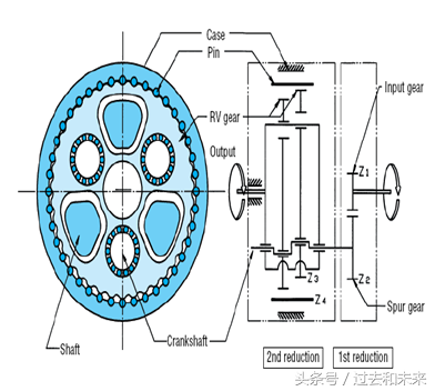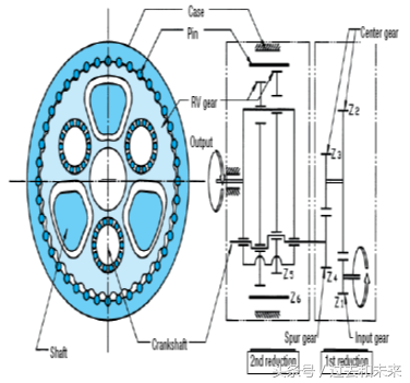 第二级减速透过正齿轮驱动偏心轴,带动安装在偏心轴上的RV齿轮,引起两个RV齿轮的偏心运动。两个RV齿轮以180°的相位差带动输出轴,以提供平衡载荷。